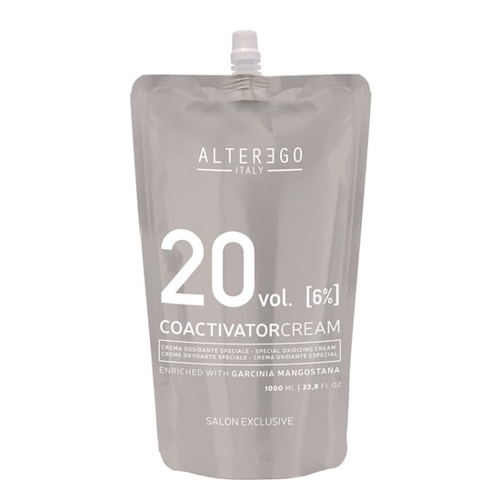 Alter Ego Utleniacz 20vol 6% 1000ml Stabilizowany krem utleniający wzbogacony w innowacyjne środki kationowe nowej generacji o właściwościach pielęgnujących. Specjalna kremowa formuła łatwa do zmieszania ma działanie odbudowujące i wygladzające strukturę włosa. Lekka i bogata konsystencja nie tylko poprawia efekt koloryzacji i dekoloryzacji ale również pozwala na łatwą aplikację. Zawiera nadtlenek wodoru.